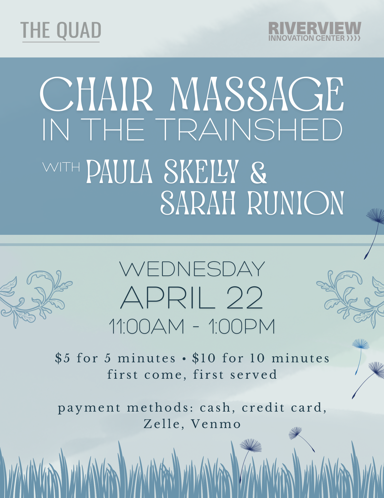 Paula Skelly & Sarah Runion will be offering affordable chair massages in the Train Shed on Wednesday April 22nd 11:00am - 1:00pm